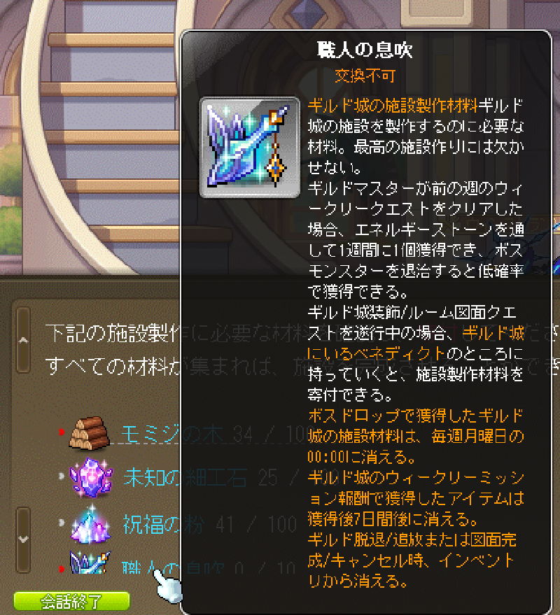 このクエストを受託した後、狩り、ボス、もしくは特定の条件を満たすと、ETCアイテムを入手することができます。