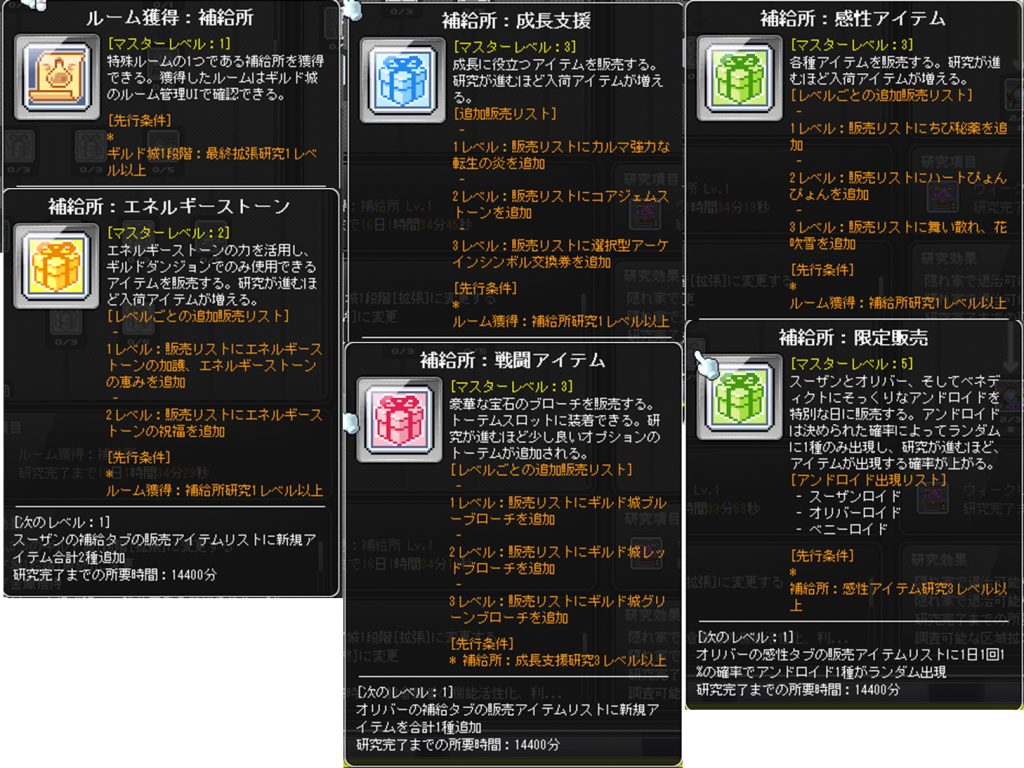 公式HPによると、補給所では、強化材料、秘薬、装備、消費アイテムなど様々なアイテムが購入できるようです。よく見るとギルド城ブローチ(トーテムかバッチ?)や、アンドロイドなどがあり、単純に既存アイテムが買えるようになるだけではないみたいです。