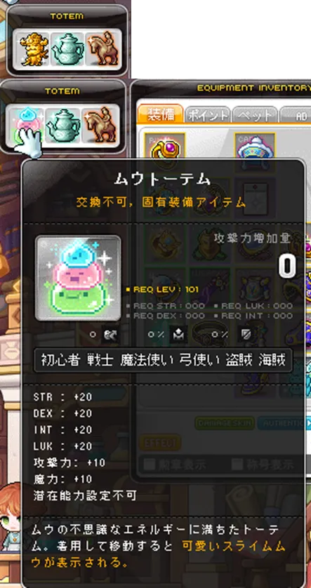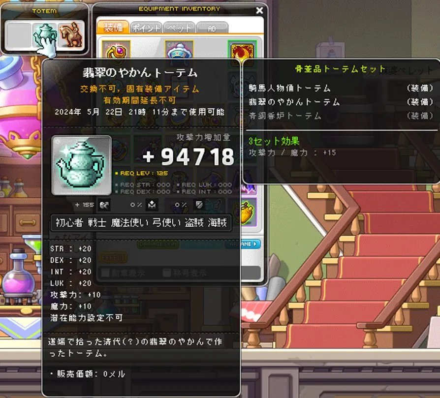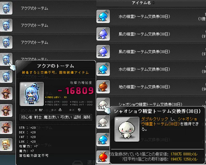 シャオショウ精霊トーテム、○○の精霊トーテムは、課金ランダムボックスのハズレ枠です。シャオショウ精霊はALL+18 AMA+8、○○の精霊は1ステータス+25 AMA+5。 有期限ですが、メイプル広場から7日間50万メル(30日間で約220万メル)で期限を延長させることができるので実質無期限です。