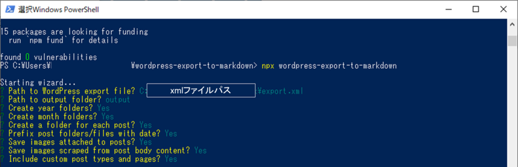 npm install最後にnpxでwordpress-export-to-markdownを実行