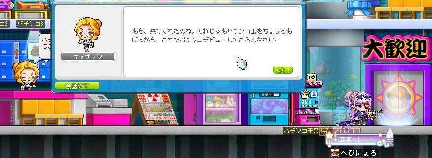 パチンコを打つにはパチンコ玉が必要となります。ポイントで購入もできますが、ここは古のメイプラーらしく、パチ屋のNPCキャサリンに話しかけて1日100玉貰います。