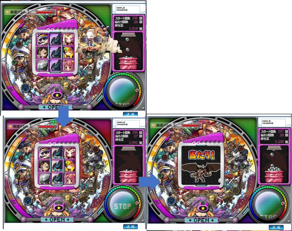 実際のパチンコは知りませんが、メイプルのパチンコはプレイヤーが介入する要素は一切ありません。それどころか、ハンドルの強弱、スタート・ストップ以外の一切の操作は不可能です。移動もフレチャも出来ません。