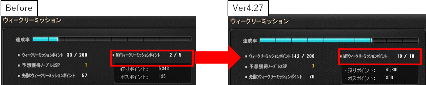 ウィークリーミッションのノルマは据え置き、1キャラあたりのウィークリーミッションポイントが倍に。1人1人の貢献度が大きくなりました。デイリーと週ボスに行けば意識せずとも最大値10ポイントに達すると思います。