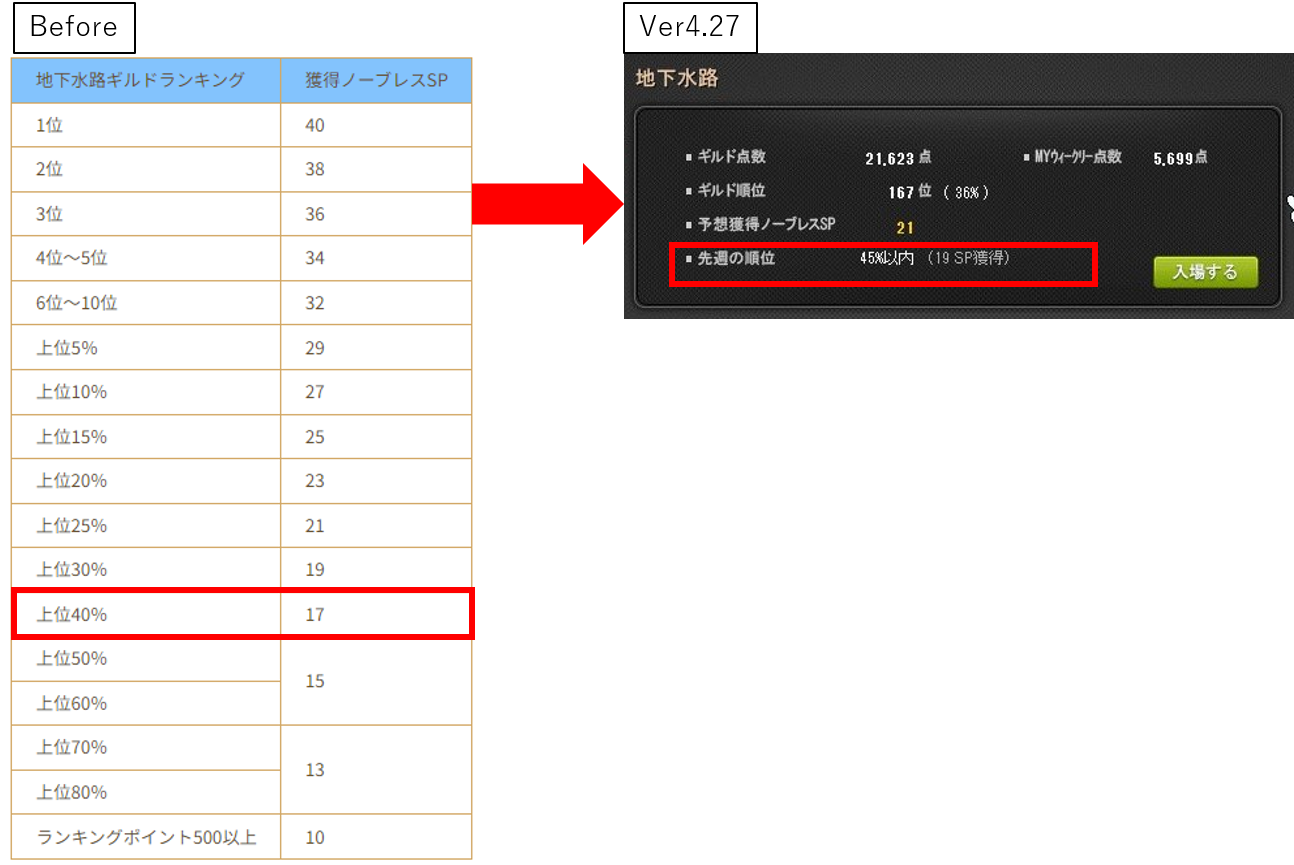 水路のギルドランキング点数で貰えるポイントが増えました。例えば先週水路の順位が45%以内の弊ギルドの場合ですと、
