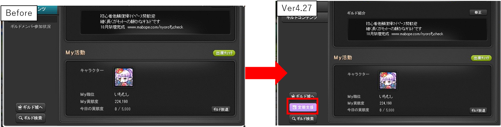 -ボタン使用時ギルド定期支援スキルレベルによってGポーションとギルドの祝福、またはギルドのより大きな祝福を受けることができ、受け取ったアイテムは次の木曜日0時まで使用できます。