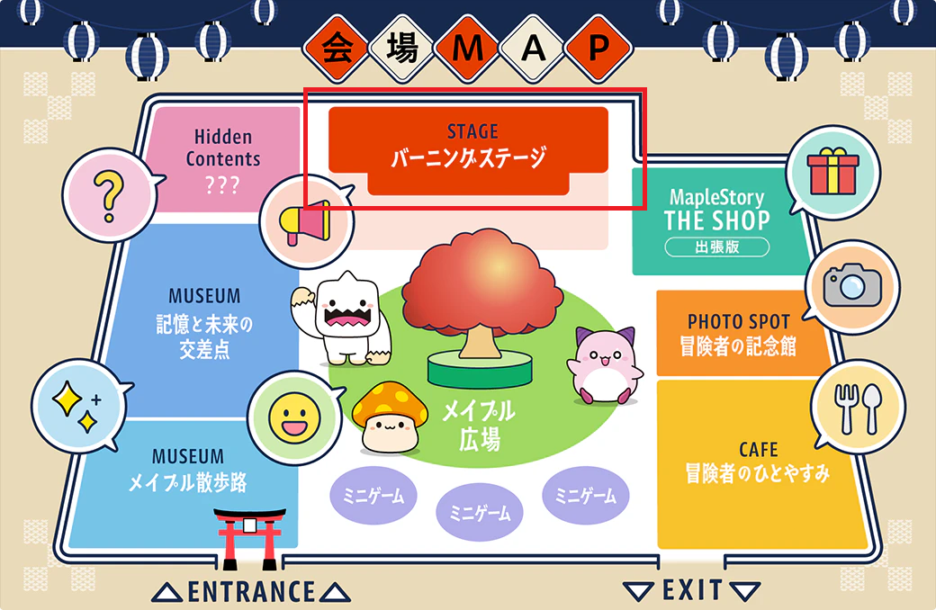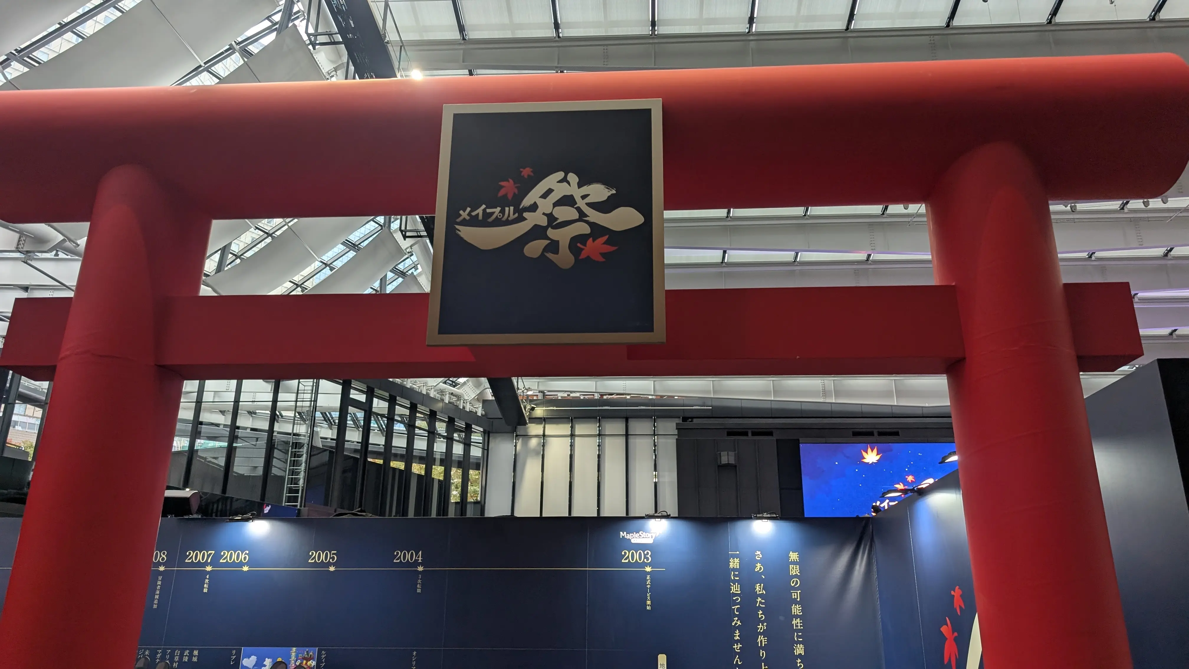 会場内はパネル展示が行われていました。入場してすぐ、メイプル散歩路には、メイプルワールド~アーケインリバー~テネブリスのパネルと、22年の歩みを綴った年表の展示がありました。
